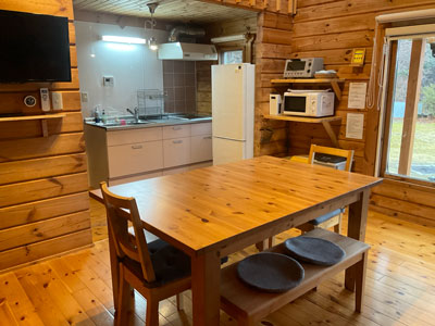 冷蔵庫(240L) 、IHクッキングヒーター、カセット調理器、鍋、土鍋、フライパン、皿、茶碗、包丁、まな板、炊飯器、ボウル、ザル、トレイ、ミキサー、キッチンばさみ、ピーラー、おろし器、菜ばし、缶切り、へら、定員分の湯飲み、グラス、コップ、急須、鍋敷き、台ぶきん、箸、食器用洗剤、食器洗い用スポンジ、台ぶきん、電子レンジ、オーブントースター、湯沸かしポット